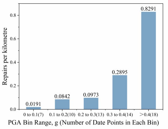 Based on the seismic context data and basic pipeline information, the repair rate for buried pipelines in the study area can be estimated using the buried pipeline vulnerability function proposed in this study. In this study, the repair rate is defined as the number of individual repair sites per kilometer of pipeline, representing the spatial frequency of locations requiring repair. This includes both leaking and ruptured sections of the pipeline, rather than the total number of repair actions performed.