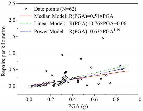 Through the above screening, 62 sample points were finally selected from the seismic hazard dataset. Due to the large dispersion of data, the study divided the PGA range to better identify the relationship between repair rate and PGA, as shown in Figure 4. It was found that PGA is positively correlated with the repair rate. Therefore, the study selected multiple positive-correlation function models for fitting, including the median model, the linear model, and the power model, as shown in Figure 5. The specific formulas are given by: