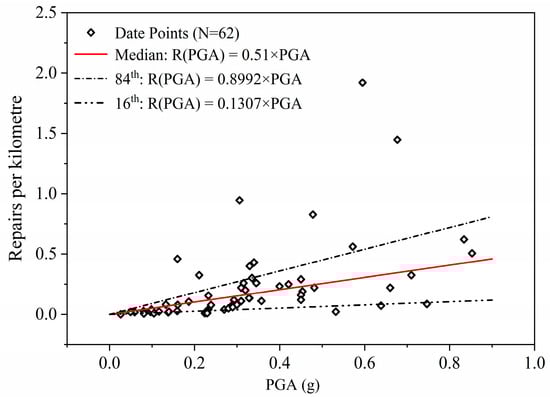 This study refers to the method of Eidinger [], which selects the median model to analyze the actual data distribution. Compared to the linear and power models, the median model can more accurately describe the range of pipe repair rate variation with PGA. It provides estimated regression coefficient values at different quartiles to depict its distribution.