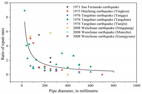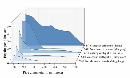 Typically, larger-diameter pipes demonstrate enhanced seismic performance. The repair rate of buried pipelines of various diameters in different earthquakes has been statistically analyzed, as shown in Figure 7. From the figure, it is evident that in most cases, the repair rate of buried pipelines decreases with increasing pipe diameter.