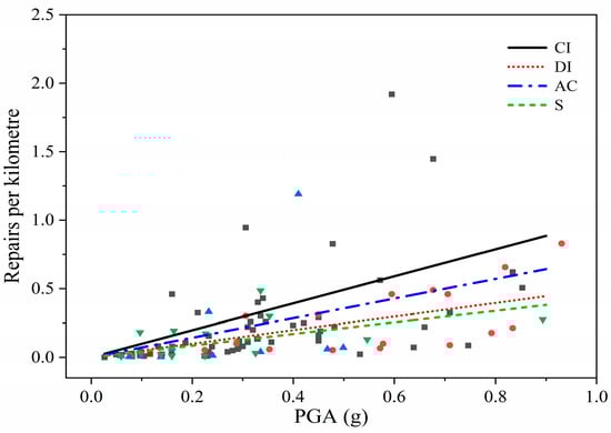 The sample point distribution was then analyzed by pipe material (Figure 3), including gray cast iron pipes (CI), ductile iron pipes (DI), steel pipes (S), and asbestos cement pipes (AC). The analysis revealed that the highest concentration of samples (0.20–0.41 g PGA range, corresponding to Intensity VIII) was observed in this moderate intensity range, with gray cast iron pipes being the predominant material type.