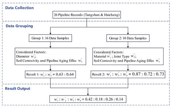 The Analytic Hierarchy Process (AHP), a well-established multi-criteria decision-making method, effectively incorporates domain expert knowledge by structuring complex problems and enabling quantitative evaluations. This study focuses on four primary influencing factors: pipeline material (), pipe diameter (), joint type (), and the combined effects of soil corrosivity and pipeline aging (). Drawing on expert judgment, the relative importance of these factors is assessed through pairwise comparisons using the 1–9 scale method to construct a judgment matrix, as presented in Table 11.