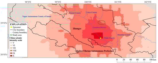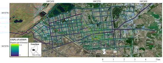 Assume an MW 8.0 earthquake occurred at 2:00 a.m. on a workday in June 2022 at the junction of the Yumushan eastern margin and the Minle-Damaying fault in China. The epicenter was located at 100.5° E and 38.44° N. Figure 13 shows the seismic impact area of this earthquake scenario. Under this scenario, the city center of Ganzhou District falls within the VIII and IX (CSIS) intensity zones. This section evaluates the potential damage to buried water supply pipelines in the city center of Ganzhou District under this earthquake scenario.