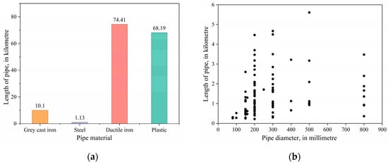 The total length of buried water supply pipes in the study area is 153.83 km. Figure 14 summarizes the distribution of pipes in the area by material and diameter. The figures indicate that ductile iron and plastic pipes are the predominant types of buried water supply pipes in the study area, while grey cast iron and steel pipes are less common. Additionally, there is a higher proportion of small-diameter pipes.