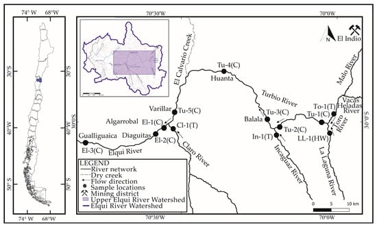 The geology of the Elqui river basin comprises several rock units, from Paleozoic to Quaternary. Specifically, the high-altitude domain includes a series of volcanic sequences of the Cenozoic age. Two of these are of particular relevance: (a) the Doña Ana Formation (Upper Oligocene–Lower Miocene), with rhyolites, rhyolitic tuffs, andesites and basaltic andesites, and (b) the Infiernillo Unit (Lower Miocene). Additionally, several (i.e., more than thirty) large hydrothermal alteration zones are present within a N–S belt of ~200 × 20 km, many of which exhibit advanced argillic alteration mineral assemblages, with kaolinite, alunite, and silica jaspers [,]. Thus, the area, particularly that of the Toro River, has conditions favorable for the natural development of ARD []. In addition, ARD generation has been enhanced by anthropogenic factors, such as the past development (1981–2002) of the El Indio-Tambo mining district located in the Andes Mountain range, located in the Malo River sub-basin [,]. The ore body is mainly characterized by massive enargite–pyrite–alunite and alunite–quartz veins with native sulfur in the upper levels of the deposit (copper phase) and Au–quartz ore (gold phase) []. This acid drainage condition is reflected in the system by the contribution of the Malo River, which flows into the Toro River. Previous assessments have shown, for the latter pH in the range of 4 to 5, high total concentrations of As (0.1–0.4 mg/L), Cu (7–10 mg/L), SO42− of about 1000 mg/L, and electrical conductivity of about 1 to 2 mS/cm. [,]. Thus, the water system is enriched in metal(loid)s in the water column and sediments. On the other hand, tributaries from the southeast (i.e., La Laguna, Incaguaz, and Claro) present mostly alkaline pH (7–8) [,] conditions with a lower metal(loid) content, thus diluting their presence throughout the basin [,,]. These mixed conditions between tributaries with different water qualities provide the study area with particular interest as it becomes a “natural laboratory” to study the behavior of metal(loid)s. In fact, studies have indicated that confluences that mix tributaries affected by acid drainage with others of better quality play a significant role in the attenuation of metal(loid)-enriched particles from the water column [,,].