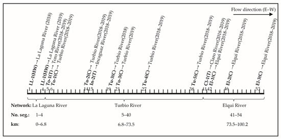 On the other hand, when comparing the modeled flows with those estimated from the hydraulic variables, an underestimation was mainly observed in the Turbio River section, from the confluence with the Incaguaz River (In-1) to the Elqui River location in Diaguitas (El-2). This may result from possible diffuse inflows in that reach of the river, as tentative suggested by Rossi et al. [].