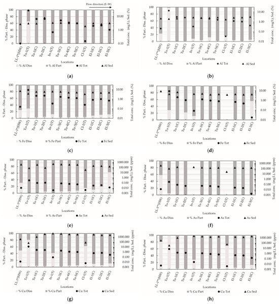 Longitudinal profiles of the dissolved and particulate phase of concentrations of metal(loid)s in the water column (left axis) and total concentrations of metal(loid)s in the water column and sediment (right axis). (a) Al, 2018 campaign; (b) Al, 2019 campaign; (c) Fe, 2018 campaign; (d) Fe, 2019 campaign; (e) As, 2018, campaign; (f) As, 2019 campaign; (g) Cu, 2018 campaign; (h) Cu, 2019 campaign. LL-1*: 2018 campaign; LL-1**: 2019 campaign; Diss: dissolved concentration; Part: particulate concentration; Tot: total concentration; Sed: sediment concentration. HW: headwater, initial location of the modeling network; T: tributaries; C: control locations. Notes: 1. Locations without percentages refer to total concentrations reported as below the detection limit; 2. The Tu-2 location, in the 2019 campaign, did not report data on sediment concentration.