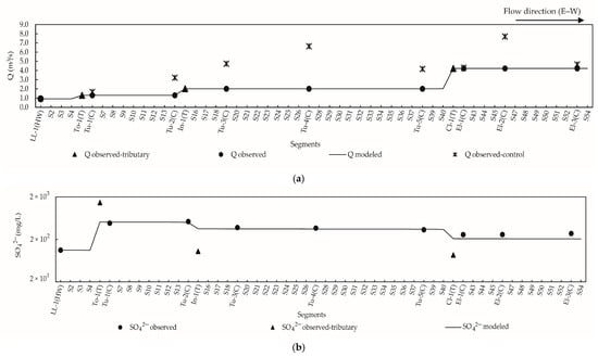 Longitudinal profiles of observed and modeled flows (Q) and sulfates (SO42−). (a) Flow, 2018 campaign; (b) SO42−, 2018 campaign. Observed-tributary: data from tributaries; observed-control: data from control locations. HW: headwater, initial location of the modeling network; T: tributaries; C: control locations.