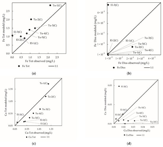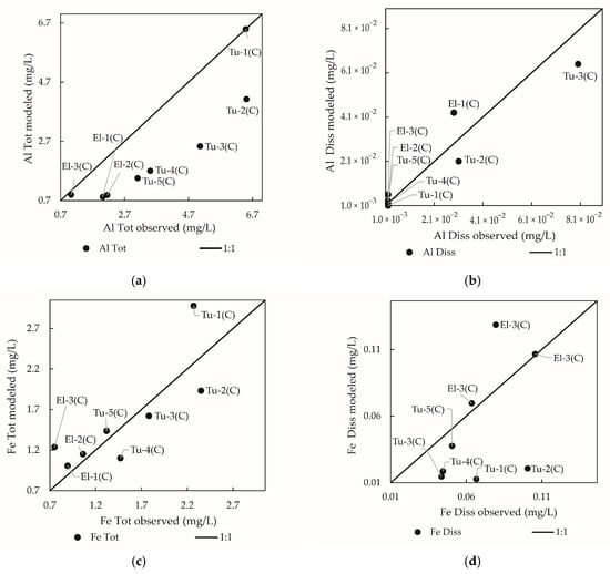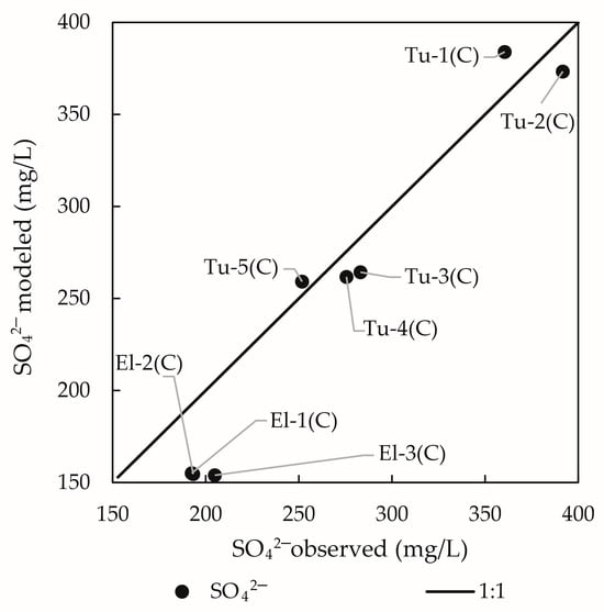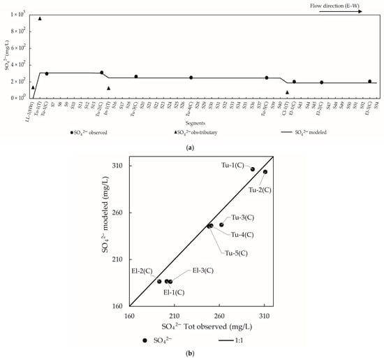 Figure 5 shows that the modeled SO42− concentrations followed the observed concentrations trend along the network, with some underestimation of the concentrations (except for To-1 and Tu-5 locations), mainly when observed flow rates at control points exceeded modeled values (Figure 4).