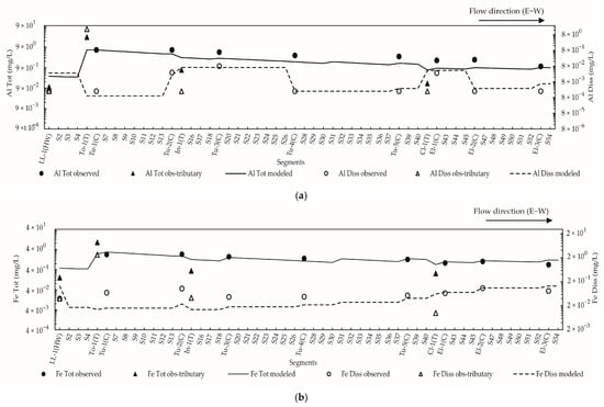 Data from the September 2018 campaign were used for model calibration because they presented the most unfavorable scenario, i.e., higher total concentrations of Al, Fe, As, Cu and SO42−, and lower flow rates, compared with the data from the 2019 campaign. Therefore, the data from the 2019 campaign were considered for validation using the calibrated parameters, i.e., partition coefficient (Kd), sedimentation velocity (Vs), and resuspension velocity (Vr).
