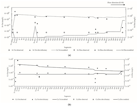 The transport of the water quality constituents (Al, Fe, As, Cu, and SO42−) of the present study was simulated using a constant flow with the advanced toxicant module for one dimension. This model consists of the water column systems (total and dissolved concentrations) and solids (total suspended solids and total sediment concentrations). It is important to note that the advance toxicant module does not consider the direct influence of pH and ionic strength. Therefore, this process is captured by sorption instead of simulating precipitation, simplifying the way in which the precipitated metals are adsorbed directly onto the particles. This may cause deficiencies in the modeling of mineral Fe and Al phases []. However, this simplification has been described as adequate in systems with pH ranges between 5 and 8. As the acid tributary (Rio Toro) was considered a boundary condition, the water modeled network ranges around pH 8. Thus, it is also feasible to consider global pH-related parameters as representative of the entire modeled network, such as the partition coefficient (Kd) (which describes the sorption process) [].