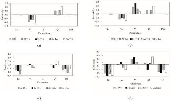 Sensitivity was calculated with the factors 0.1 and 0.5 (10% and 50% difference, respectively) according to the disturbance of the calibrated parameters (Vs, Vr, Kd) in addition to the boundary conditions (flow rate(Q)) and total suspended solids (TSS). A positive sensitivity value means that an increase (or decrease) in the disturbed parameter will increase (or decrease) the concentrations of the modeled variable; a negative sensitivity value means that the value of the modeled variable will increase (or decrease) contrary to the setting of the disturbed parameter.