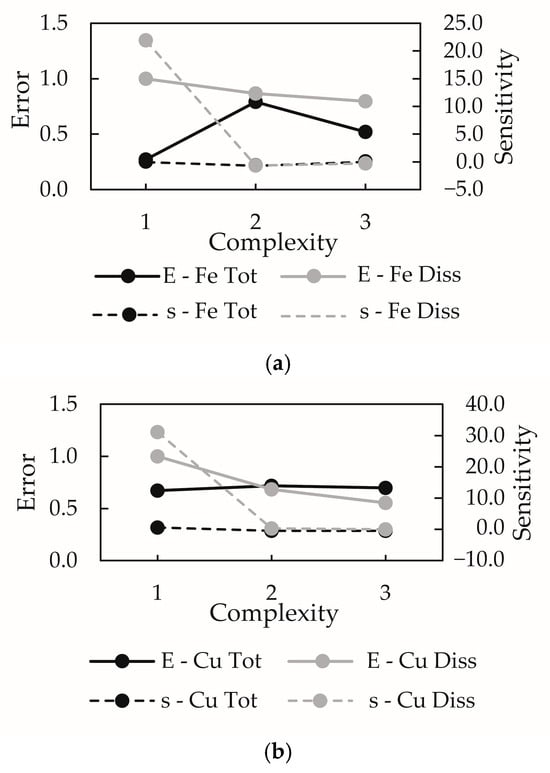In addition to the modeling, a sensitivity analysis was performed to evaluate the response of the model to disturbances of the calibrated parameter values (Kd, Vs, and Vr), the boundary conditions (flow rate (Q)) and total suspended solids (TSS). This methodology follows the hypothesis described in Lindenschmidt et al. [], which states that sensitivity (s, Equation (3)) increases with higher model complexity, while model error (ε, Equations (4) and (5)) decreases with increasing complexity.
