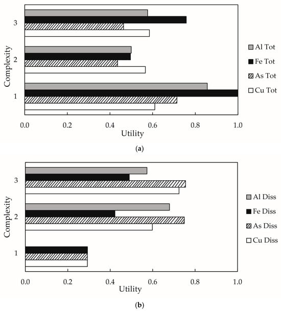 Total concentrations were generally higher during September 2018, with a decreasing trend towards downstream locations (Table 2; Supplementary Materials, Table S5). The peaks in the concentrations of constituents are characteristic of acid drainage at the Toro River location (To-1, Figure 3). Likewise, given the acidic pH (average 4.5), it was observed that Al and Cu travel mainly in the dissolved phase (over 60%), while As is mostly in the particulate phase, with a percentage over 95%. In watersheds affected by acid drainage, the total and dissolved concentration of copper may range from 0.5 to 170 mg/L and from 0.03 to 6.0 mg/L, respectively []. This range is consistent with the concentration of copper in the Toro River, with slightly higher dissolved concentrations. Subsequently, metal(loid)s were found to travel mainly in the particulate phase downstream of the Toro and La Laguna confluence. This is attributed to the alkaline environment (provided by the alkaline waters of the La Laguna, Incaguaz, and Claro rivers), which, among other factors, favors the precipitation of metal(loid)s.
