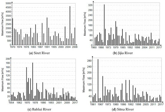 Figure 3 shows the time series of maximum annual flow rates recorded for the rivers Siret, Jijia, Bahlui, and Sitna, Romania.