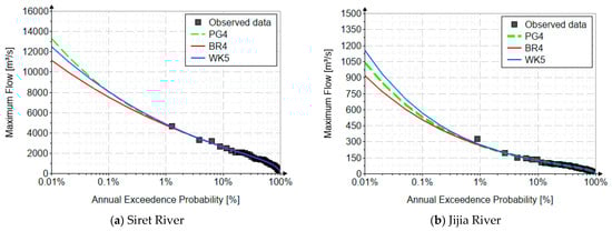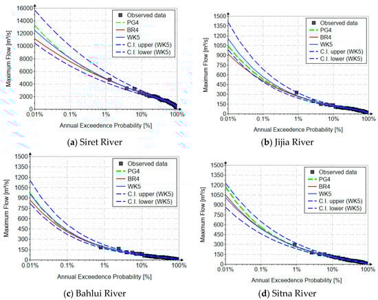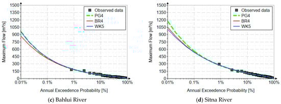 Figure 4 shows the fitting distributions for the four rivers. Hazen’s empirical probability was used for plotting position [50]. The horizontal axis is on a logarithmic decimal scale.
