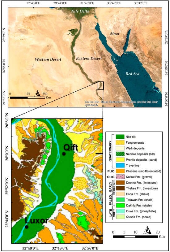 This research was carried out in the East Desert, specifically within the Qift–Qena region of Egypt. This area experiences semi-arid climatic conditions, with limited availability of surface water, making groundwater exploration essential to meet the increasing demands for domestic, agricultural, and industrial water usage. Geographically, the Qift study area lies within the Qena district, a well-developed region in southeastern Egypt, spanning approximately 2 km2. It is situated between longitude 32.84° E and latitude 25.916° N, extending to longitude 32.912° E and latitude 26.058° N (Figure 1). The study area encompasses three distinct geomorphological units: the Nile floodplain and the Eastern and Western Plateaus flanking the valley [43] (Figure 1). These plateaus are primarily composed of Early Eocene massive limestone formations (brown). Along the footslopes overlooking the valley, outcrops of Cretaceous–Paleocene rocks, primarily consisting of marls and shales, are observed. The valley itself is filled with Pliocene–Quaternary alluvial and fluvial deposits. Geologically, the Qena region forms part of the Stable Shelf described by [44]. The origin of the Qena Bend is attributed by many authors to the rejuvenation of old northeast–southwest Precambrian faults that underlie northwest–southeast and north–south trends. El Kazzaz (1999) [45] proposed that this is a complex zone accommodating shifts between different segments of the Nile Valley that were caused by the reactivation of the northeast–southwest Qena–Safaga Shear Zone during the Red Sea rifting. This reactivation, involving leftward movement, diverted the Nile. While El-Gaby et al. 1988 [46] see this shear zone extending across the bend, Akawy 2002 [47] links it to the Aqaba fault system. Later studies by Akawy and Kamal El Din (2006) [48] suggested that after the Early Eocene, the area was affected by rightward movement along northwest–southeast and then north–south faults, which eventually became normal faults before the Pliocene.