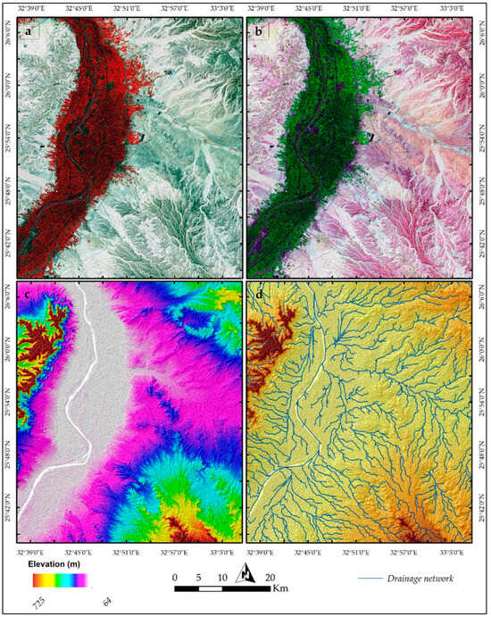 Sentinel-2 FCCs in RGB showing (a) bands 8-4-3 and (b) bands 12-6-2, illustrating the main distribution of land cover types, including water, vegetation, and key lithologies within the study area. (c) The DEM of the study area highlights the decrease in elevation toward the central part and its impact on the drainage network, as shown in (d), as it channels water toward the Nile River.