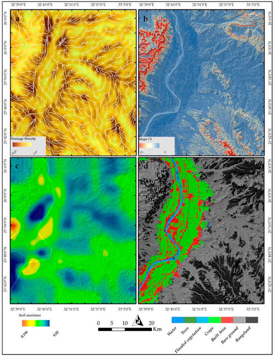 Key surface criteria influencing groundwater potential in the study area, including (a) drainage density, (b) slope in degrees, (c) soil moisture derived from SMAP/Sentinel-1, and (d) LULC.
