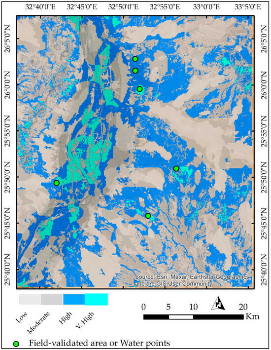 Ground-truthing was conducted by comparing the predicted zones with on-site measurements. Six verification points were spatially distributed across the study area, specifically located within zones identified as having high to very high groundwater potential based on the GWPM results. These points were selected to represent a range of hydrogeological settings and were either verified through direct field visits or confirmed to host existing water wells. The verification process involved cross-referencing the mapped zones with actual groundwater presence and well performance, thereby validating the model’s predictive capability.