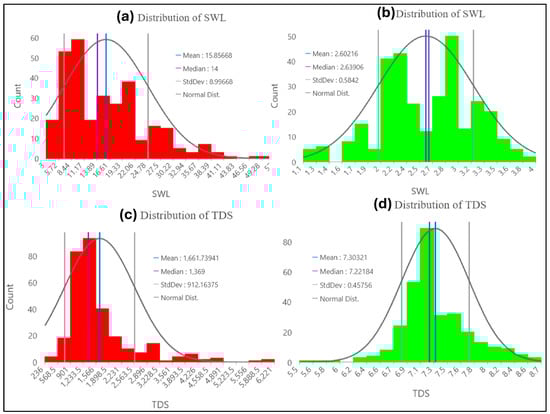 Histograms showing the SWL and TDS distribution data (in red) and their log-transformed data (in green).