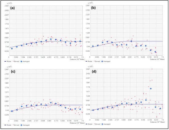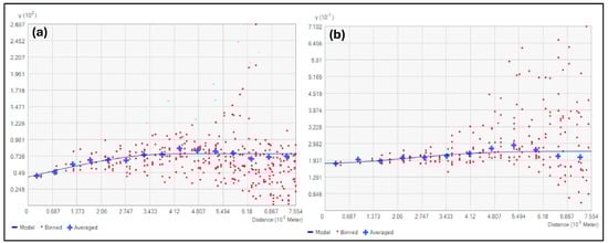 The geostatistical analysis in this study began with exploratory data analysis (EDA) to assess the spatial characteristics and distribution patterns of SWL and TDS. The cumulative frequency distributions of these parameters were evaluated, and transformations, such as log normalization, were applied to better approximate normal distributions, facilitating more accurate geostatistical modeling [52]. The analysis involved the derivation and modeling of empirical variograms for the transformed parameters. Empirical variograms describe the spatial continuity of the data by quantifying the variance among values at varying distances [53,54]. The standard equation used to calculate the empirical variogram is as follows: