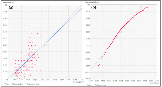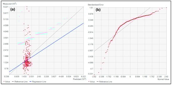 For SWL (Table 3), the model was validated using 286 data points. The mean absolute error (MAE) was exceptionally low at 0.040, indicating a high degree of agreement between the predicted and observed values. The RMSE was calculated as 3.135, reflecting minimal dispersion of prediction errors and suggesting that the model performs well even for larger deviations. Furthermore, the mean standardized error was 0.015, very close to zero, confirming the absence of significant systematic bias in the predictions. The root mean square standardized (RMSS) value of 0.935, being close to the ideal value of 1, indicates that the kriging standard errors are well calibrated and that the uncertainty estimates are statistically reliable. The associated prediction and normal Q-Q plots (Figure 9) visually support the consistency between the observed and predicted SWL values, further reinforcing the model’s robustness.