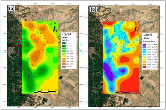 Maps of the geospatial distribution using the kriging method. (a) The SWL prediction surface and (b) the corresponding prediction standard error map.