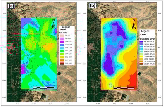 Maps of the geospatial distribution using the kriging method. (a) The TDS prediction surface and (b) the corresponding prediction standard error map.