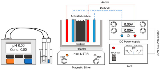 Additionally, to evaluate the adsorption performance of activated carbon alone, a baseline adsorption experiment was conducted by adding activated carbon at a dosage of 100 g/L into the reactor without applying electrochemical treatment. The results were compared with those obtained from the electrochemical process under various conditions.