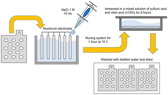 The electrodes used in this study were made of soluble aluminum with dimensions of 105 mm (W) × 110 mm (L) × 5 mm (H). To minimize the dead space during operation and promote effective sample circulation, the electrodes were fabricated in a porous form. To reduce errors caused by surface contaminants or impurities, the aluminum electrodes underwent a pretreatment process, as illustrated in Figure 2. The electrodes were first installed in a reactor containing a 10 mM NaCl solution and subjected to electrochemical treatment for 1 h. The samples were then immersed in a mixed acid solution containing more than 10% sulfuric and nitric acids for 8 h, followed by thorough rinsing with distilled water and drying.