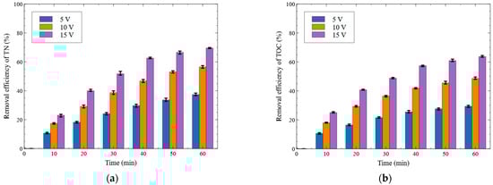 As shown in Figure 4a, the T-N removal efficiencies of the samples collected at 10 min were 10.64%, 17.38%, and 23.03% under the applied voltages of 5, 10, and 15 V, respectively. This indicated that the removal efficiency increased by 12.39% at 15 V compared to that at 5 V. The difference in removal efficiency became more pronounced over time; at the final sampling point (60 min), the T-N removal efficiencies were 37.37%, 56.49%, and 69.53% under 5, 10, and 15 V, respectively, showing a 32.16%p increase at 15 V compared to 5 V.