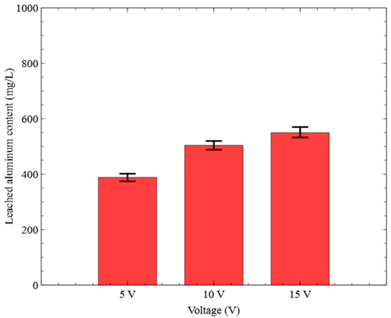 Figure 5 shows the concentration of Al leached in the final sample collected at the end of the 60 min treatment. The Al concentrations were measured as 388.39 mg/L at 5 V, 504.28 mg/L at 10 V, and 549.83 mg/L at 15 V. These results indicated that the amount of Al leached increased by 161.44 mg/L under the 15 V condition compared to 5 V.