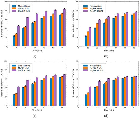 Effect of electrolyte on the removal efficiency ((a) NaCl addition—T-N removal, (b) Na2SO4 addition—T-N removal, (c) NaCl addition—TOC removal, and (d) Na2SO4 addition—TOC removal (Al electrode, 15 V)).