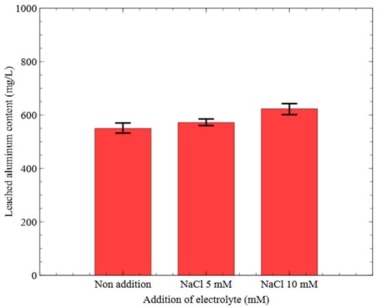 Figure 7 presents the concentrations of Al leached in the final samples collected after 60 min under 15 V with and without NaCl electrolyte supplementation. The Al concentrations were 549.83 mg/L for the non-addition condition, 571.70 mg/L for NaCl 5 mM, and 623.06 mg/L for NaCl 10 mM. These results indicated that Al leaching increased by 73.23 mg/L under the NaCl 10 mM condition compared to non-addition.
