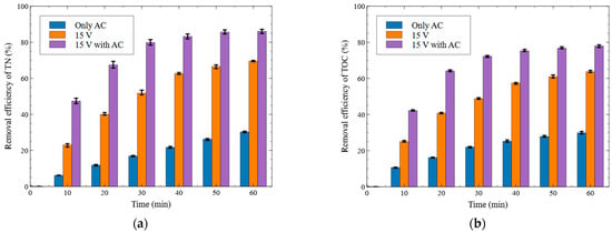 As shown in Figure 8a, the T-N removal efficiencies at 10 min were 6.13% for the only AC conditions, 23.04% at 15 V, and 47.37% at 15 V with AC. Although the only AC condition showed a lower removal efficiency than the 15 V condition, the 15 V with AC condition exhibited a 24.33%p improvement compared to 15 V alone. At the final treatment time (60 min), the T-N removal efficiencies were 30.24% for only AC, 69.53% for 15 V, and 86.04% for 15 V with AC, indicating a 16.51%p increase in the 15 V with AC condition compared to 15 V.