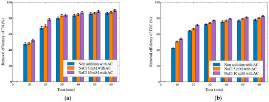 As shown in Figure 6c, the TOC removal efficiencies at 10 min under the conditions of non-addition, NaCl 5 mM, and NaCl 10 mM were 25.04%, 27.51%, and 41.94%, respectively. Under the presence of NaCl 10 mM, the removal efficiency increased by 16.90%p compared to that of non-addition. This difference decreased over time, and at 60 min, the removal efficiencies were 63.68%, 65.72%, and 70.13% for non-addition, NaCl 5 mM, and NaCl 10 mM, respectively, resulting in a 6.45% increase at NaCl 10 mM compared to non-addition.
