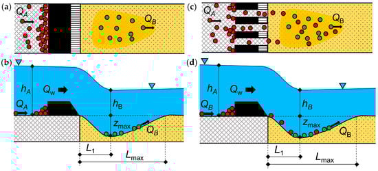 Sediment transport arrangements within the local scour. (a) Clear-water conditions—plan view, (b) clear-water conditions—profile view, (c) live-bed conditions—plan view, (d) live-bed conditions—profile view; QA, QB (m3 s−1) denote the sediment transport capacity upstream and downstream of the hydraulic structure; Qw (m3 s−1) is the water discharges; hA, hB (m) are the water depth upstream and downstream of the hydraulic structure; zmax (m) is the maximal local scour depth; L1 (m) is the distance between the weir foundation and the deepest local scour level; and Lmax (m) is the maximal local scour length.