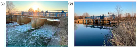 The Piaseczno damming weir on the Radomka River. (a) View from tailwater; (b) view from headwater.