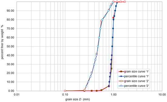 Sieve analysis was conducted on three soil samples collected from the riverbed during field investigations of the full-scale weir. The results were then averaged and plotted on a grading curve. One type of sand filled the downstream side, where erosional processes were taking place (grain size curve “2” in Figure 3). In contrast, the upper side was filled with stained sand (grain size curve “1” in Figure 3). For this investigation, granulometric characterization was performed on a set of three extracted samples. Statistical parameters of the bedload grain size distribution were determined by a graphical method, using percentiles read from the cumulative grain size curve. The grain size curve was developed according to the actual dimensions of di sieves (mm). The experimental methodology adhered to standard procedures of soil recognition according to PN-EN ISO 14688:2006 [26], classifying the soil as medium sand with a density of 2.62 g/cm3. Characteristic diameters of the studied soil were as follows: D5 = 0.273 mm, D10 = 0.300, D50 = 0.475, D60 = 0.505 mm, D90 = 0.800 mm, D95 = 0.869 mm.