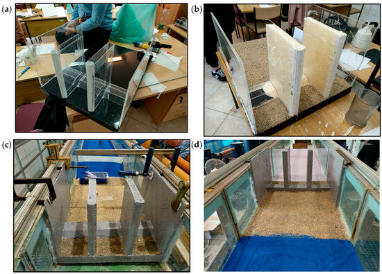 A model of the weir, a 1:30-scale reproduction of the full-scale object (Figure 4), was developed in the laboratory and mounted within a 9.0 m long flume with a cross-section of 0.58 m in width and 0.70 m in height. Sheets of Plexiglas were used, joined with acrylic glue and sealed with silicone (Figure 4a). The voids in the pillars and threshold were filled with mounting foam to ensure the structure’s stability (Figure 4b). The structural elements were covered with sand, which was then fixed with varnish, to replicate the roughness of hydraulic concrete. Each span of the weir measures 16.0 cm. The thickness of the abutments is 2.0 cm, and their length is 48.5 cm. The pillars were designed with a 3.0 cm thickness and 23.0 cm length. The threshold height is 3.5 cm and the abutment and pillar height is 50 cm.