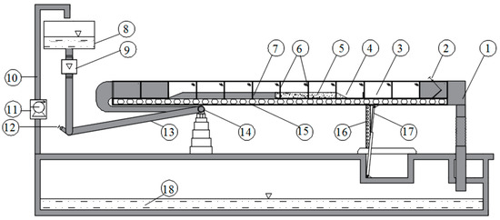 Schematic diagram of the laboratory flume, where 1—discharge chamber, 2—control gate, 3—glass wall, 4—sediment collection chamber, 5—sandy bed, 6—glass wall supports, 7—concrete bed, 8—upper tank, 9—electromagnetic flow meter, 10—inlet pipeline, 11—pump, 12—control valve, 13—supply pipeline, 14—hinged support, 15—flume support, 16—flume slope adjustment support, 17—hydraulic cylinder, 18—lower tank.