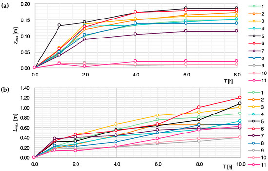 An analysis of the maximum local scour depth and its length evolution over time is presented in Table 4 and Figure 7. For the initial conditions (T = 0 h), the flume bed was horizontal, which corresponds to a maximum scour depth zmax of 0.0 m and maximal scour length Lmax of 0.0 m.