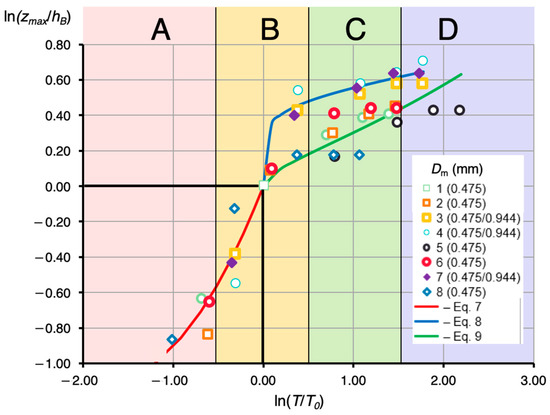 For the ratio (T/To) > 1.0, the behavior of the curve depends on other factors. A key factor identified is the relationship between the average velocity vB (ms−1) at water depth hB (m) and two threshold velocities: the velocity of intense scouring vr and the non-scouring velocity vd. These threshold velocities were determined from the Hjulström diagram [28] at the boundary between the sediment transport and erosion phase. For the material from grain size curve “1” (Dm = D50 = 0.944 mm), the values are vr = 0.500 m/s and vd = 0.090 m/s. For the material from grain size curve “2” (Dm = D50 = 0.475 mm), the values are vr = 0.350 m/s and vd = 0.040 m/s. The following equations were obtained: