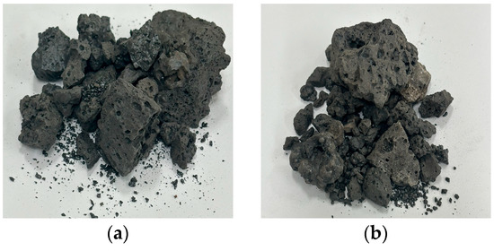 The electric arc furnace (EAF) slag used in this study was provided by a domestic steelmaking company (Company A, Busan, Republic of Korea). Two types of slags were used: oxidized slag (Figure 1a) and reduced slag (Figure 1b). The oxidized and reduced slags were generated during the EAF process under different furnace conditions: oxidized slag was produced during the oxidizing refining stage (with abundant oxygen injection), while reduced slag was formed during the reducing refining stage (with the addition of reducing agents).