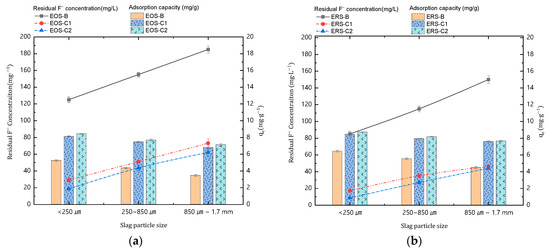 To evaluate the dependence of the fluoride adsorption performance of the slag on the particle size and slag type, synthetic HF wastewater with 300 mg/L fluoride at pH 2.5 was used. Each slag sample (EOS-B, EOS-C1, EOS-C2, ERS-B, ERS-C1, and ERS-C2, 1 g) was added to the fluoride solution (30 mL). The samples were categorized into three particle size ranges: ① 850 μm–1.7 mm, ② 250–850 μm, and ③ <250 μm. The reaction was carried out in a water bath at 25 °C and 100 rpm for 24 h, and the results are shown in Figure 2.