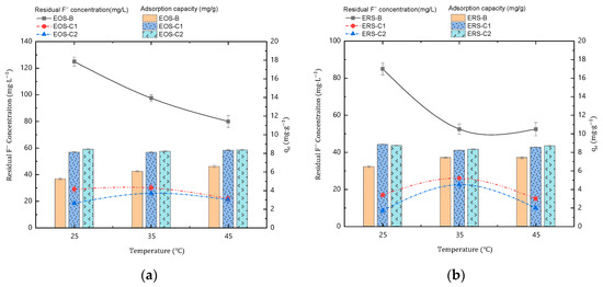 Residual fluoride concentration and adsorption capacity of slag at different temperatures: (a) oxidized slag (EOS), (b) reduced slag (ERS).