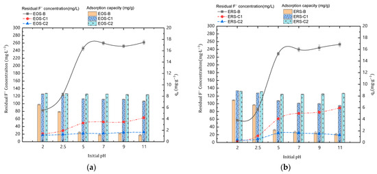 Residual fluoride concentration and adsorption capacity of slag for different initial pH values: (a) oxidized slag (EOS), (b) reduced slag (ERS).