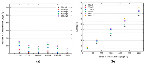As shown in Figure 5a, an increase in the initial F-concentration led to an increase in the residual F-concentration. Accordingly, the adsorption capacity increases, reaching a maximum of 16.13 mg/g for ERS-C2 at an initial concentration of 600 mg/L (Figure 5b). No maximum adsorption plateau was observed within the concentration range used in this study.