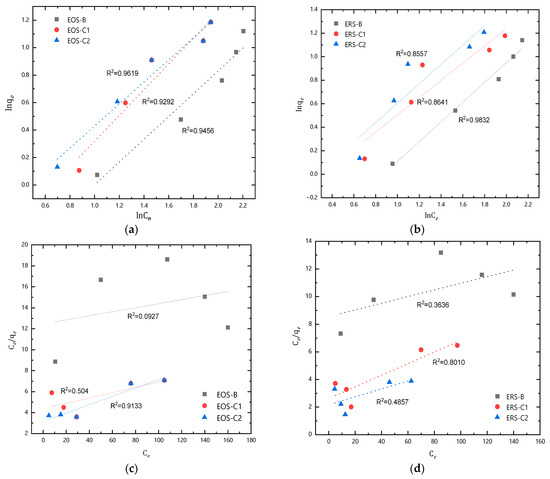 The isotherm fitting results are presented in Figure 6, and the corresponding model parameters are listed in Table 4. In the Freundlich model, the adsorption affinity constant was the highest for ERS-C2 (0.599), indicating superior fluoride uptake. By contrast, the Langmuir model predicted the highest theoretical maximum adsorption capacity () for EOS-B (52.083 mg/g), albeit with a low correlation coefficient (R2 = 0.097), indicating a poor model fit. Therefore, the overall adsorption behavior observed in this study is more consistent with the Freundlich model, which assumes multilayer adsorption.